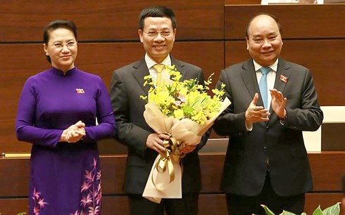 | Chủ tịch Quốc hội Nguyễn Thị Kim Ngân và Thủ tướng Nguyễn Xuân Phúc chúc mừng tân Bộ trưởng Bộ Thông tin và Truyền thông Nguyễn Mạnh Hùng. Ảnh: VOV |