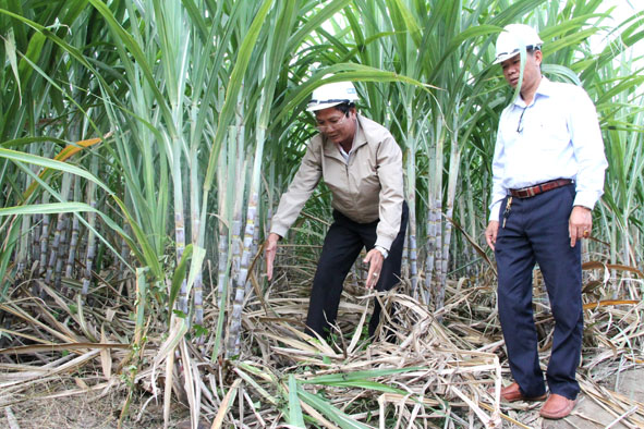 | Bí thư Chi bộ Văn phòng (Đảng bộ Công ty Cổ phần Mía đường 333) Lê Tuân (bên trái), kiểm tra vùng nguyên liệu mía của công ty. |