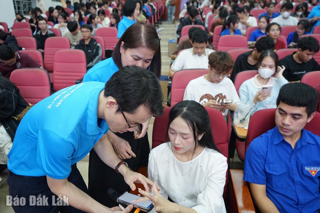 | Cán bộ Bảo hiểm xã hội tỉnh hướng dẫn sinh viên Trường Đại học Tây Nguyên tra cứu thông tin khám chữa bệnh bảo hiểm y tế trên ứng dụng VssID. |