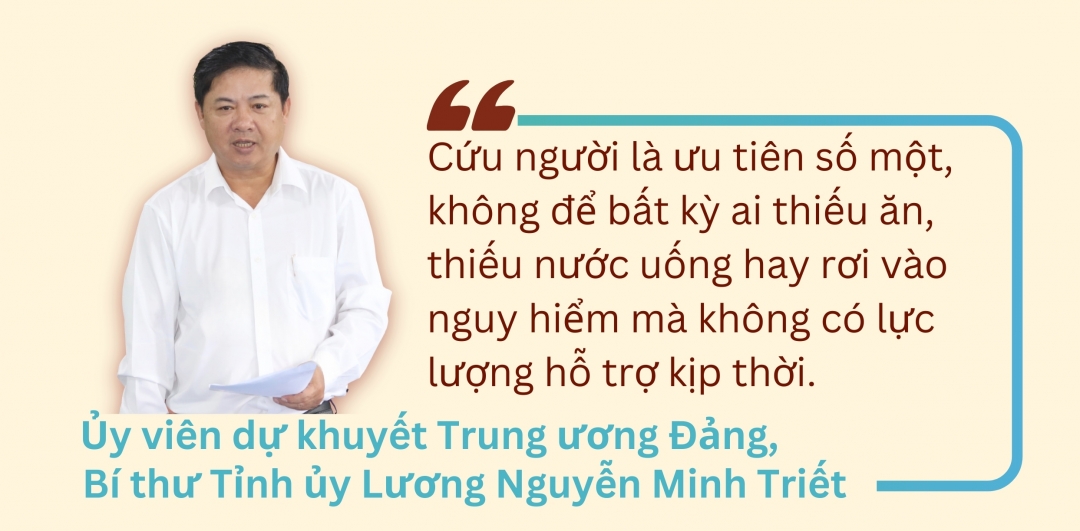 Đặc biệt, tại rốn lũ Hòa Thịnh, vào thời điểm nguy cấp nhất tối 19/11, đồng chí Nguyễn Thượng Hải, Ủy viên Ban Thường vụ Tỉnh ủy, Trưởng Ban Tổ chức Tỉnh ủy, đã dùng mô tô nước chở lãnh đạo xã đi khảo sát địa bàn, nắm thông tin để lập phương án ứng cứu, hỗ trợ bà con. Chỉ đạo trực tiếp tại hiện trường là Phó Bí thư Thường trực Tỉnh ủy, Chủ tịch HĐND tỉnh Cao Thị Hòa An và Phó Chủ tịch UBND tỉnh Nguyễn Thiên Văn. Ngay sau đó, đồng chí Lương Nguyễn Minh Triết cũng trực tiếp có mặt, chỉ đạo công tác cứu hộ, cứu nạn trong điều kiện vô cùng khẩn trương. “Cứu người là ưu tiên số một, không để bất kỳ ai thiếu ăn, thiếu nước uống hay rơi vào nguy hiểm mà không có lực lượng hỗ trợ kịp thời,” đồng chí Bí thư Tỉnh ủy chỉ đạo từ tâm lũ, thể hiện quyết tâm cao nhất trong việc bảo vệ tính mạng và an sinh của người dân.