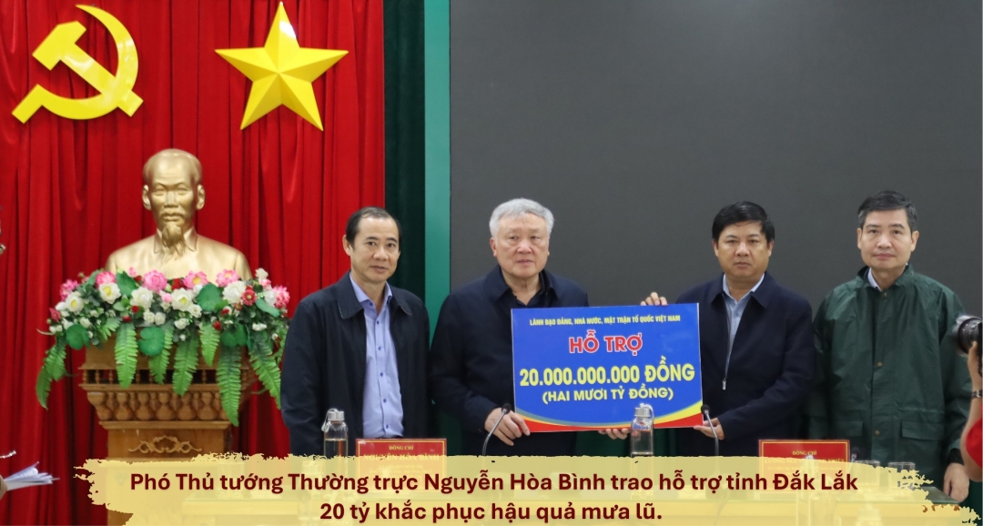 Tiếp đó, Phó Thủ tướng Thường trực Chính phủ Nguyễn Hòa Bình đã nhanh chóng có mặt tại tâm lũ Đắk Lắk. Xuyên đêm, đồng chí trực tiếp đến thăm hỏi, động viên lực lượng ứng trực tại phường Đông Hòa; đồng thời khảo sát các xã chịu thiệt hại nặng để nắm tình hình thực tế. Ngay tại hiện trường, Phó Thủ tướng chỉ đạo triển khai gói cứu trợ khẩn cấp, huy động mọi nguồn lực giúp người dân sớm ổn định đời sống, khôi phục sản xuất và từng bước vượt qua những mất mát do mưa lũ gây ra.