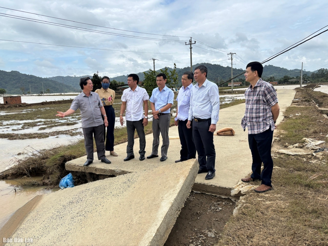 | Bí thư Đảng ủy, Chủ tịch HĐND xã Ea Ning Trần Văn Quế kiểm tra hàng hóa, nhu yếu phẩm trước khi gửi tặng người dân bị ảnh hưởng do bão lũ. |