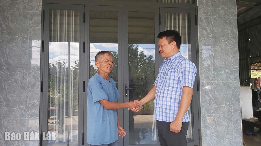 | Cán bộ Phòng Văn hóa - Xã hội xã Ea Rốk (bên trái) chia sẻ niềm vui có nhà mới với gia đình ông Hồ Văn Hoàng. |