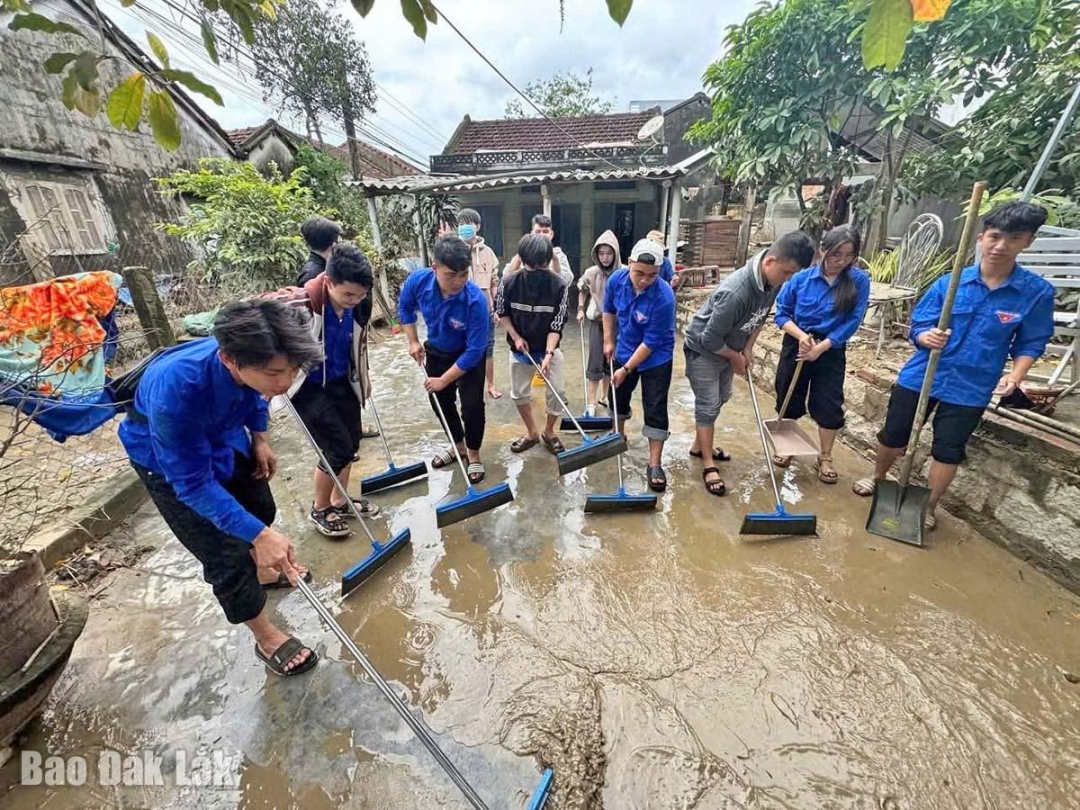 | Sinh viên tình nguyện hỗ trợ bà con nhân dân dọn vệ sinh môi trường sau mưa lũ tháng 11/2025 tại các địa phương phía Đông của tỉnh. Ảnh: Bảo Kính |