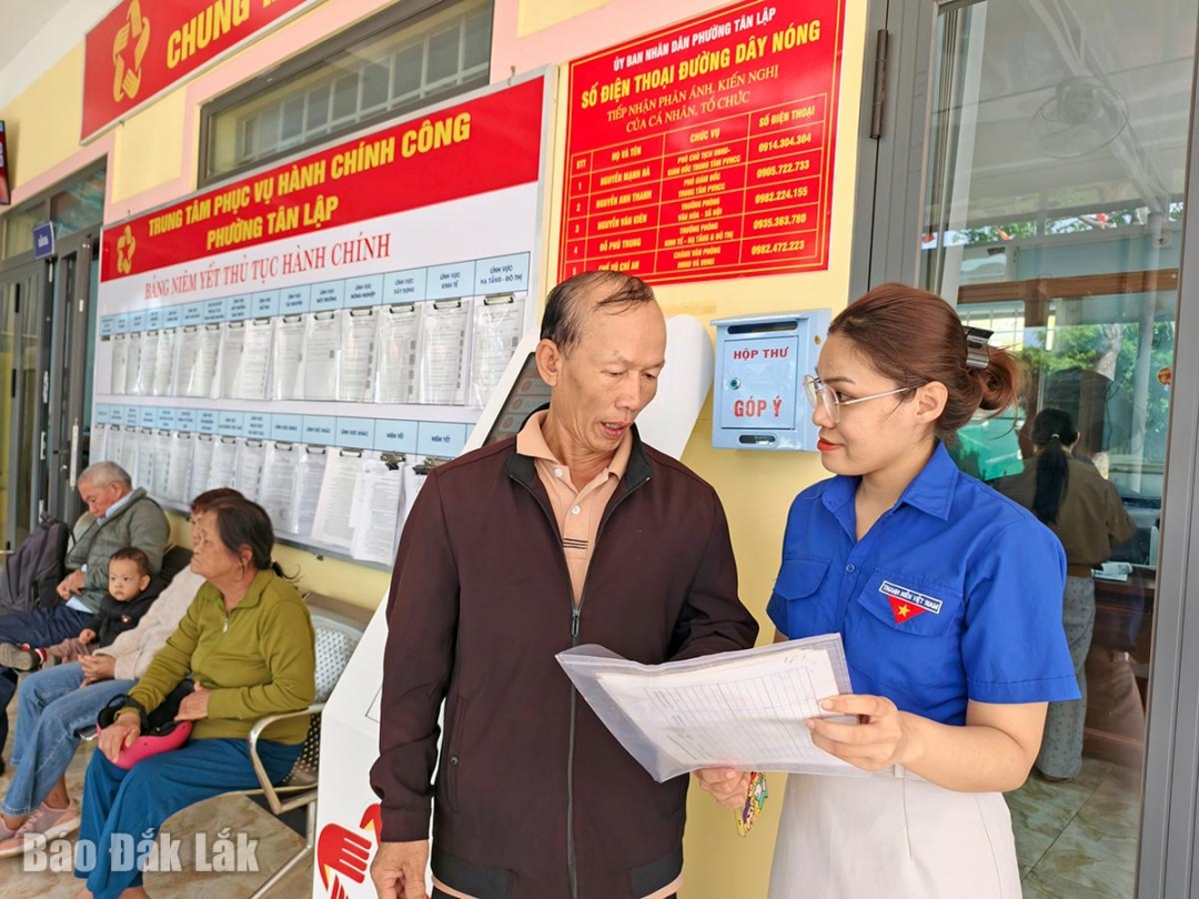 Tại Trung tâm Phục vụ hành chính công phường Tân Lập, người dân đến giao dịch được hướng dẫn bốc số tự động. Điểm đặc biệt khiến nhiều người ấn tượng là ngay tại khu vực ngồi chờ có góc nước uống, cà phê và sạc điện thoại miễn phí, kèm tủ sách pháp luật, màn hình hướng dẫn đăng ký VNeID mức độ 2. Trước cửa vào Trung tâm là hình ảnh các đoàn viên thanh niên túc trực, sẵn sàng hỗ trợ người dân khi cần. Những chi tiết tưởng chừng rất nhỏ, nhưng đủ để người dân cảm nhận được sự gần gũi, thân thiện và tinh thần phục vụ từ chính quyền cơ sở. Chị Nguyễn Ngọc Thanh Vân (trú TP. Buôn Ma Thuột) đến làm thủ tục chuyển đổi quyền sử dụng đất tại phường Tân Lập, bày tỏ: “Tôi được hướng dẫn rất nhiệt tình. Ngồi chờ còn được uống cà phê miễn phí. Khi đến lượt, cán bộ làm việc nhanh, thái độ niềm nở”.