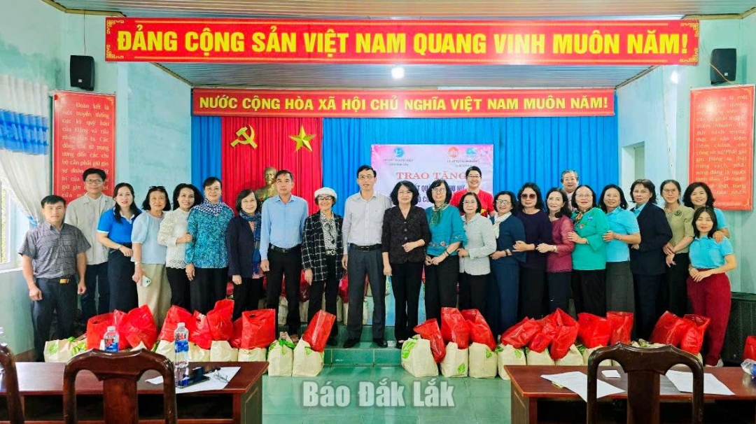 | Phó Chủ tịch Ủy ban MTTQ Việt Nam tỉnh Lê Bá Cảnh và lãnh đạo xã Ea Drông tặng quà các hộ nghèo, hộ có hoàn cảnh đặc biệt khó khăn. |