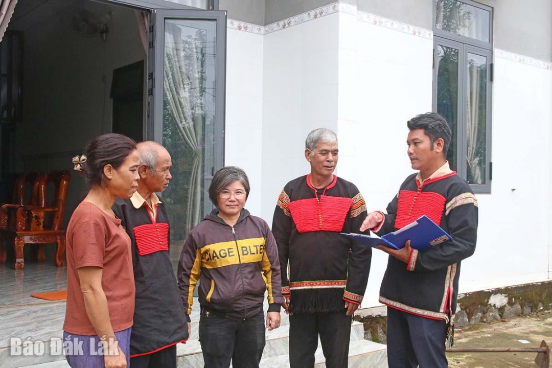 | Ông Y Păm Byă, Trưởng buôn Hra Ea Hning (bìa phải) tuyên truyền cho người dân mô hình sinh kế, tích cực tham gia các phong trào trên địa bàn. |