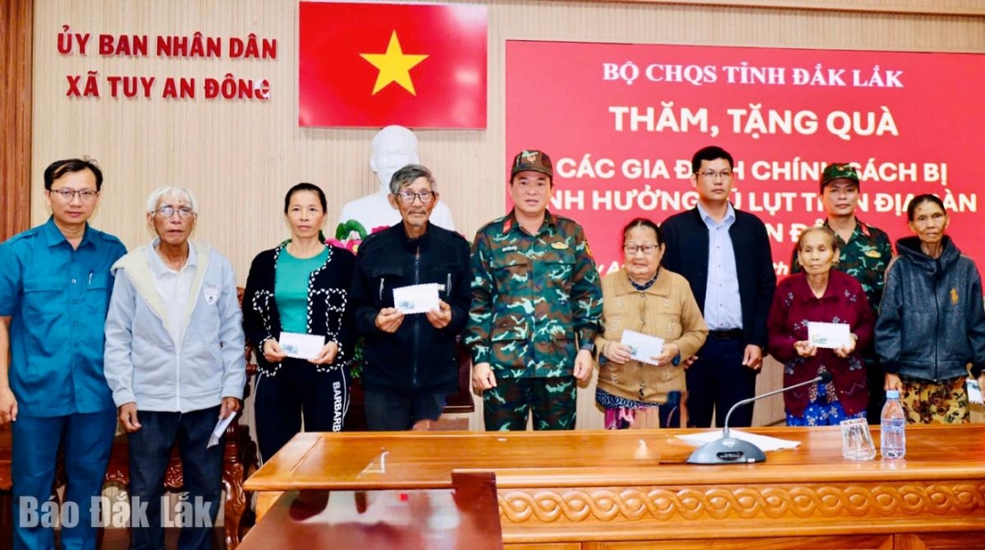 Ngày 28/11, Đại tá Đinh Văn Hưng, Chính ủy Bộ Chỉ huy Quân sự (CHQS) tỉnh đến thăm, trao quà hỗ trợ người dân bị ảnh hưởng do mưa lũ tại phường Đông Hòa và xã Tuy An Đông.