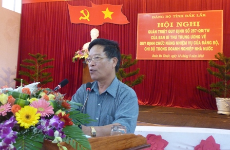 Sáng 12-5, Ban Thường vụ Tỉnh uỷ đã tổ chức Hội nghị quán triệt Quy định số 287-QĐ/TW, ngày 8-2-2010 của Ban Bí thư Trung ương Đảng về chức năng, nhiệm vụ của đảng bộ, chi bộ cơ sở trong doanh nghiệp Nhà nước (công ty cổ phần, công ty TNHH, trong đó Nhà nước sở hữu trên 50% vốn điều lệ).