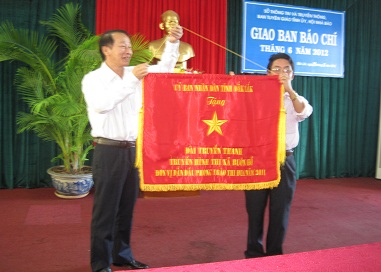 Ông Trần Hiếu, Phó Chủ tịch UBND tỉnh tặng cờ thi đua năm 2011 cho Đài truyền thanh truyền hình thị xã Buôn Hồ |