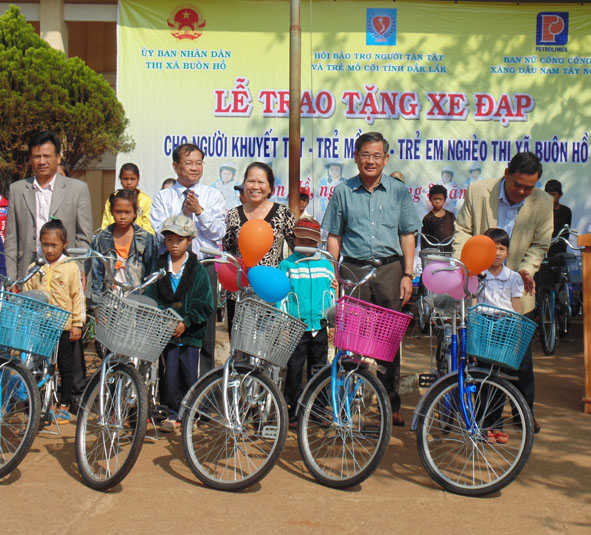 | Đại diện lãnh đạo TX. Buôn Hồ trao xe đạp tặng trẻ em có hoàn cảnh khó khăn. |