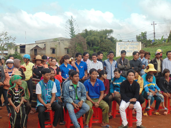 | Người dân tham gia một buổi đối thoại xin ý kiến của nhân dân về chủ trương xây dựng nông thôn mới tại xã Ea Drông (TX. Buôn Hồ). |