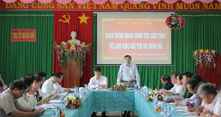 Sáng 31-3, Đoàn công tác của Thường trực Tỉnh ủy do Ủy viên Trung ương Đảng, Phó Bí thư Tỉnh ủy Trần Quốc Cường làm Trưởng đoàn đã có buổi làm việc với Thị ủy Buôn Hồ để kiểm tra tình hình phát triển kinh tế - xã hội, bảo đảm quốc phòng - an ninh quý I-2016; công tác chuẩn bị bầu cử Đại biểu Quốc hội khóa XIV và đại biểu HĐND các cấp nhiệm kỳ 2016-2021 tại địa phương.