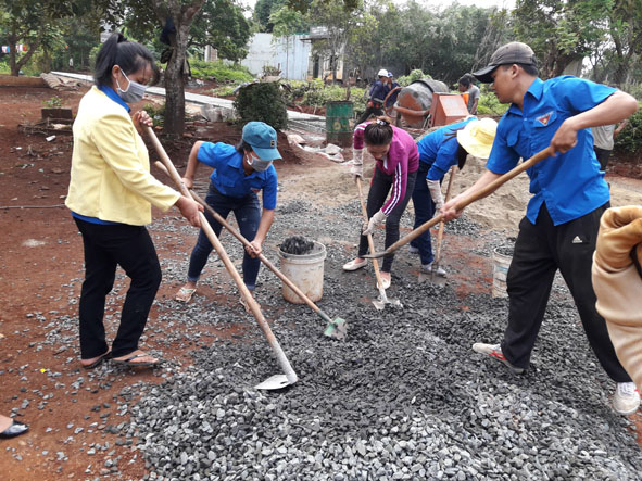 | Đoàn viên thanh niên xã Cư Êbur tham gia giúp người dân làm đường giao thông nông thôn. |