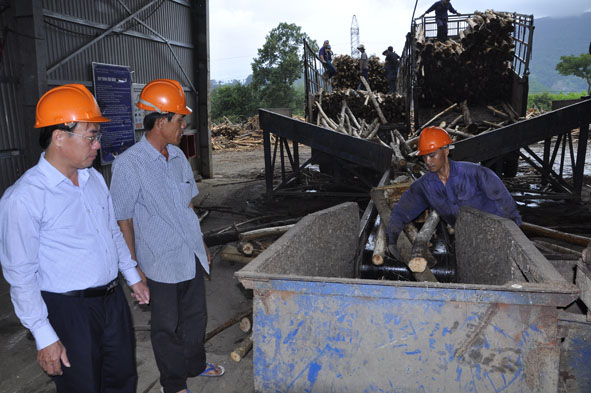 | Chủ tịch UBND huyện M'Đrắk Hòa Quang Khiêm (bìa trái) thăm Nhà máy băm dăm mảnh, Chi nhánh HTX Tiến Nam. Ảnh: N. Hoa |