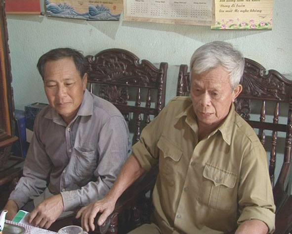| Ông Nguyễn Văn Năm (bìa phải) đến các hộ gia đình vận động người dân tham gia xây dựng nông thôn mới. |