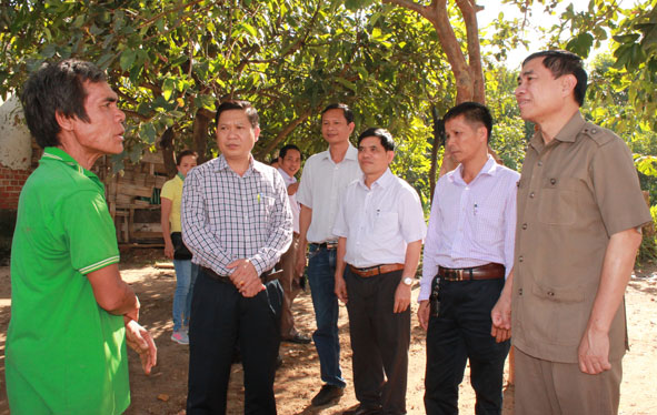 | Ủy viên Trung ương Đảng, Phó Bí thư Tỉnh ủy Trần Quốc Cường (bìa phải) cùng lãnh đạo các đơn vị thăm hỏi tình hình đời sống người dân buôn Ea Bô, xã Cư Bông (huyện Ea Kar). |