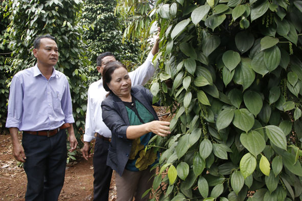 | Đồng chí Vũ Thị Oanh, Bí thư Chi bộ thôn Cư Blang, xã Pơng Drang đến thăm vườn tiêu của một đảng viên trong chi bộ. |