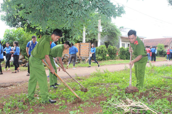 | Đoàn thanh niên Công an TP. Buôn Ma Thuột tham gia dọn vệ sinh, bảo vệ môi trường tại xã Hòa Xuân. |