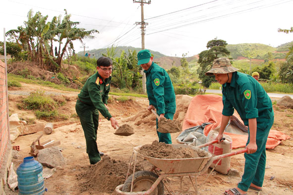| Cán bộ, chiến sĩ Ban Chỉ huy Quân sự huyện M'Đrắk giúp hộ nghèo xây dựng nhà ở. |