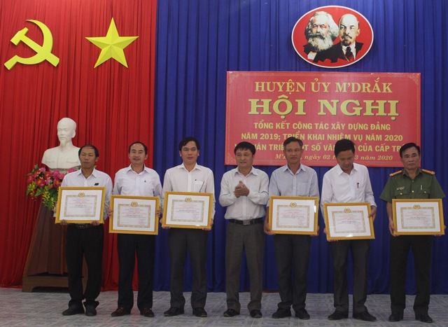 | Bí thư Huyện ủy M'Drắk Hồ Duy Thành trao giấy khen biểu dương các tổ chức cơ sở đảng hoàn thành xuất sắc nhiệm vụ năm 2019. |