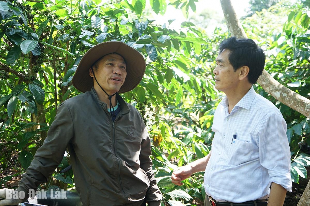 | Ông Lê Quốc Đông, Chủ tịch kiêm Tổng giám đốc Công ty TNHH Một thành viên Cà phê 49 (phải) trao đổi với hộ nhận khoán đã tham gia bảo hiểm xã hội. |