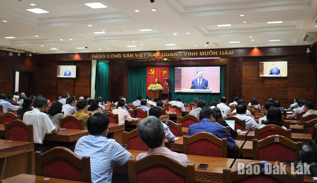 | Các đại biểu điểm cầu tỉnh Đắk Lắk nghe phát biểu chỉ đạo của Tổng Bí thư Tô Lâm. |