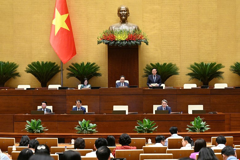 | Bộ trưởng Bộ Tư pháp Nguyễn Hải Ninh trình bày tờ trình. Ảnh: quochoi.vn |