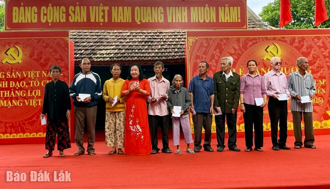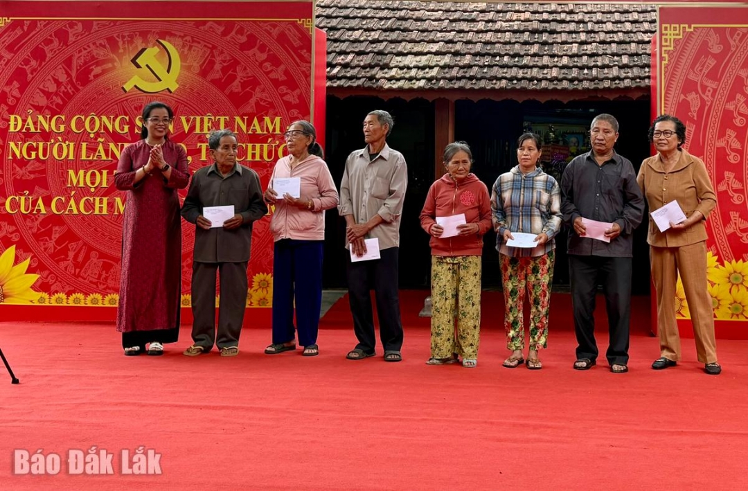 Phó Bí thư Tỉnh ủy Huỳnh Thị Chiến Hòa tặng quà cho các gia đình chính sách ở xã Đồng Xuân. |