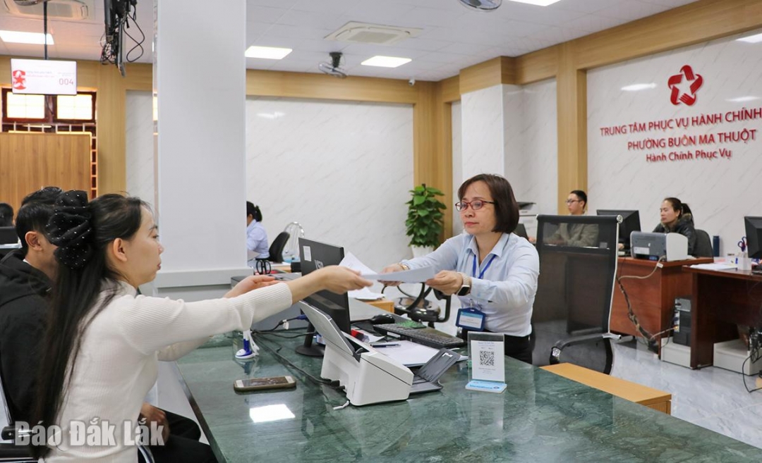 | Người dân làm thủ tục hành chính tại Trung tâm Phục vụ hành chính công phường Buôn Ma Thuột. |