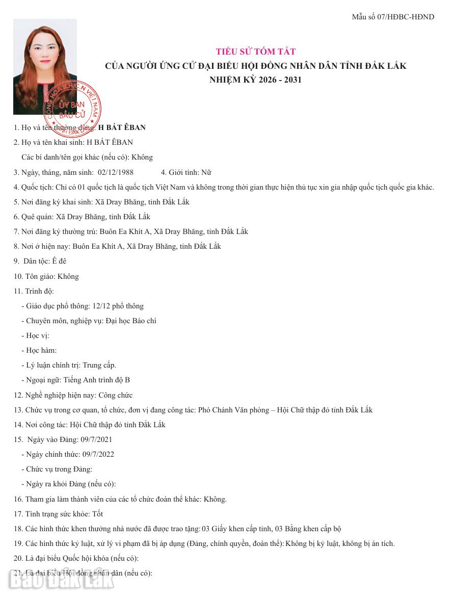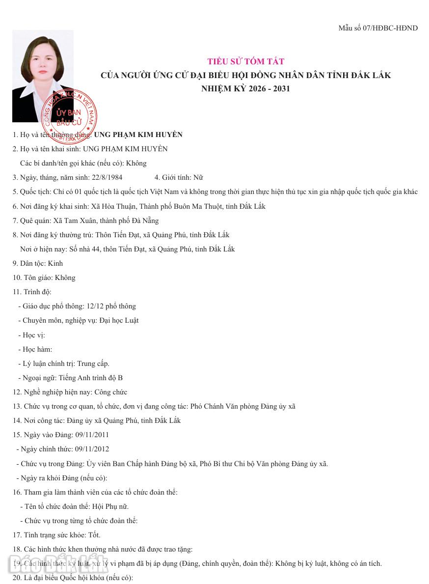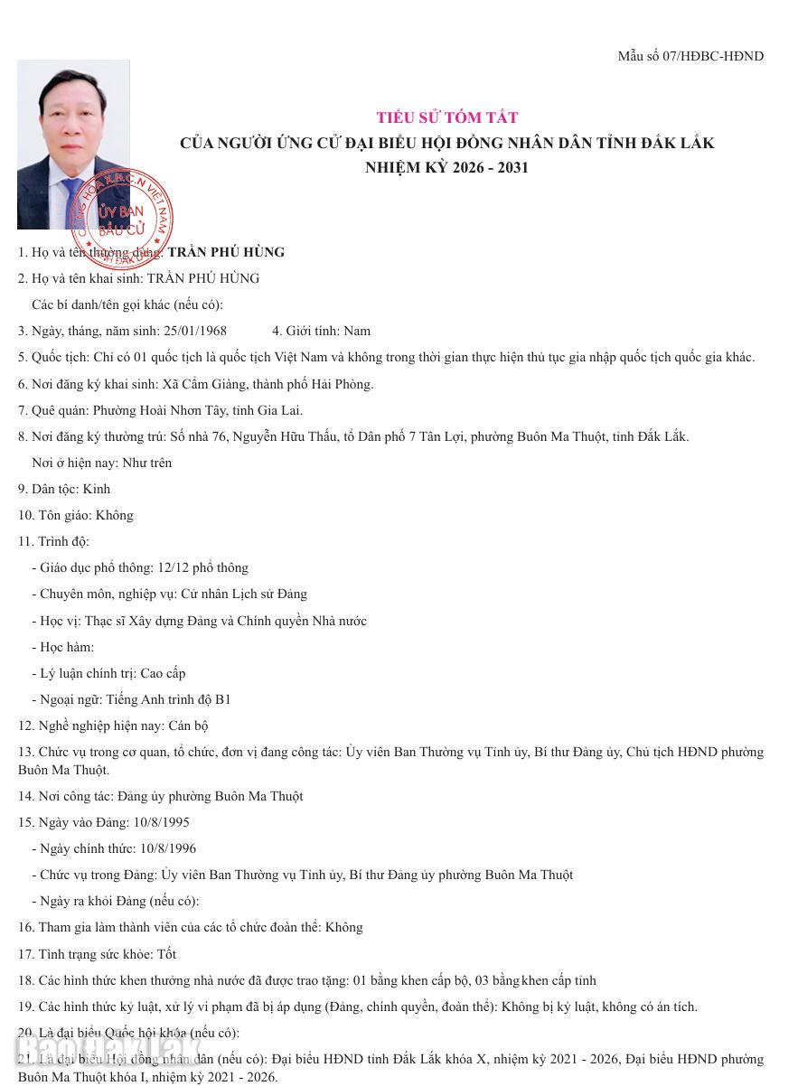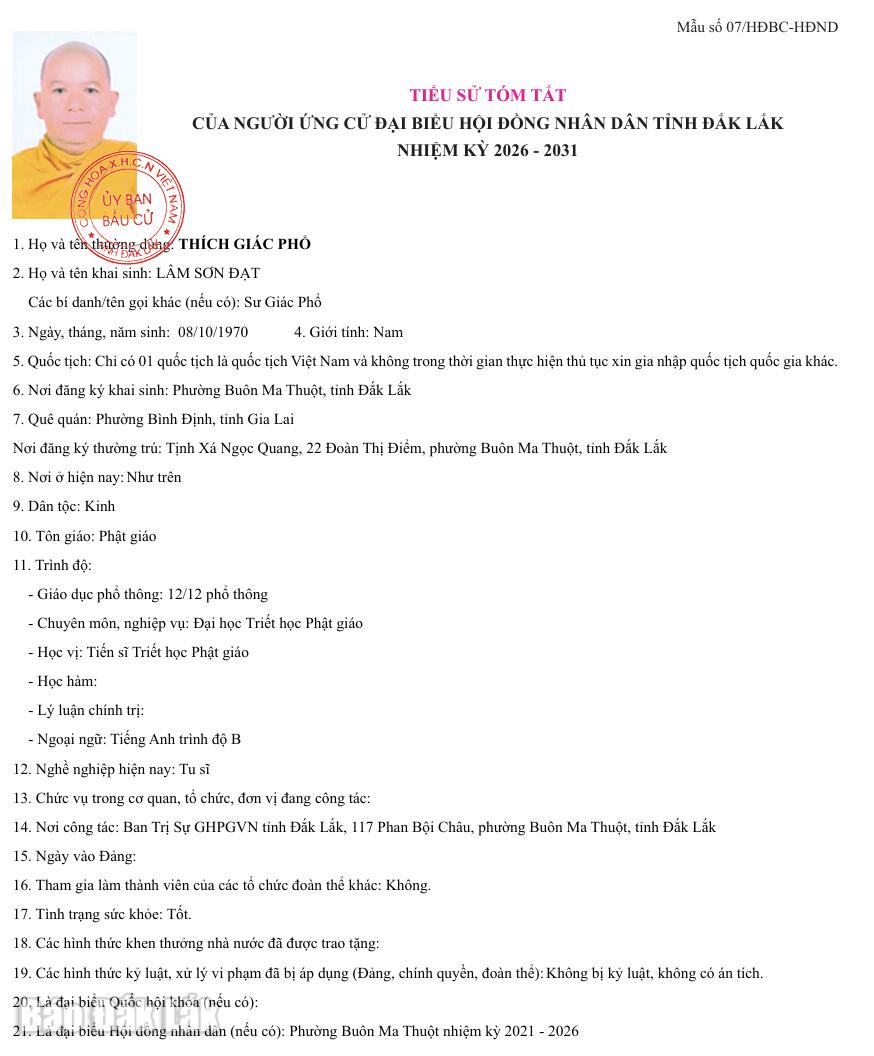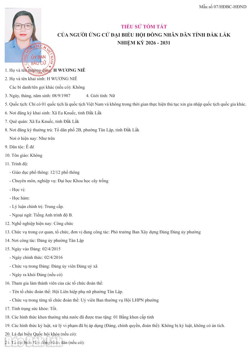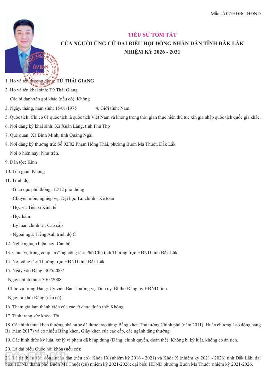 Ngày 16/2, Ủy ban bầu cử tỉnh Đắk Lắk ban hành Nghị quyết số 0122/NQ-UBBC về việc công bố danh sách chính thức những người ứng cử đại biểu HĐND tỉnh Đắk Lắk khóa XI, nhiệm kỳ 2026-2031 theo từng đơn vị bầu cử.