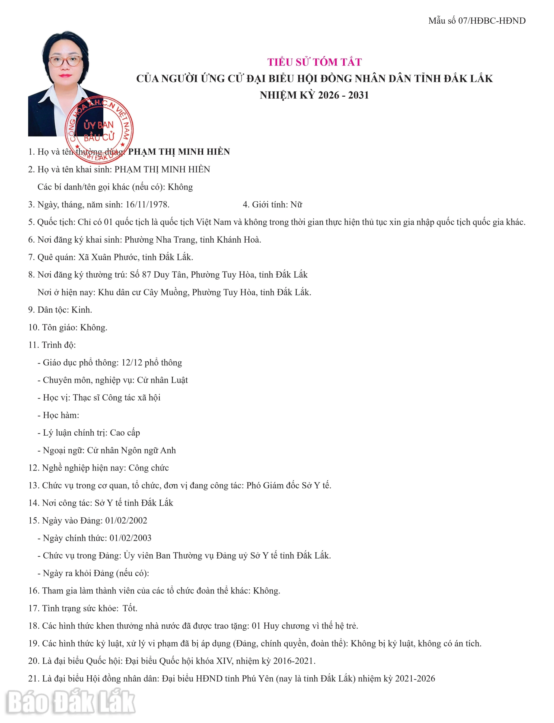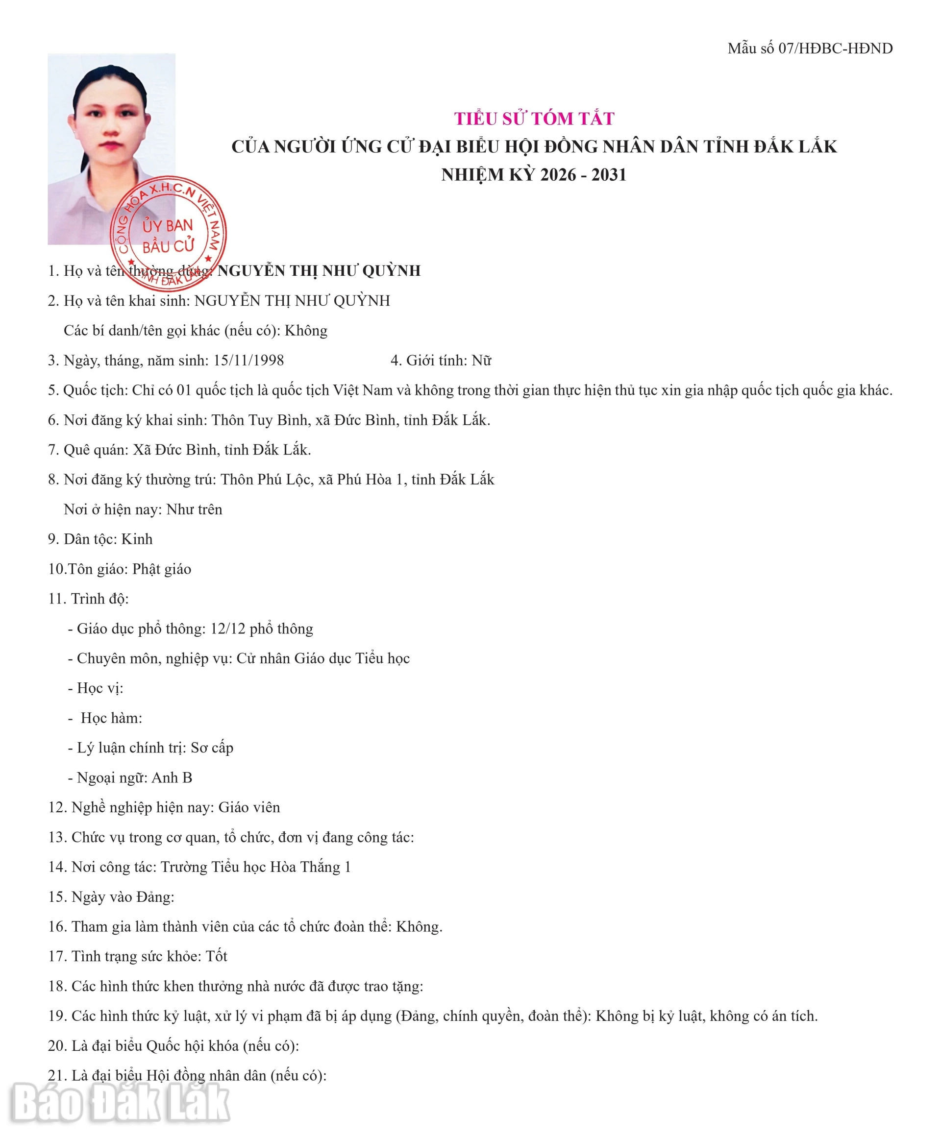 Ngày 16/2, Ủy ban bầu cử tỉnh Đắk Lắk ban hành Nghị quyết số 0122/NQ-UBBC về việc công bố danh sách chính thức những người ứng cử đại biểu HĐND tỉnh Đắk Lắk khóa XI, nhiệm kỳ 2026-2031 theo từng đơn vị bầu cử.
