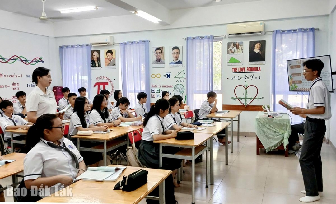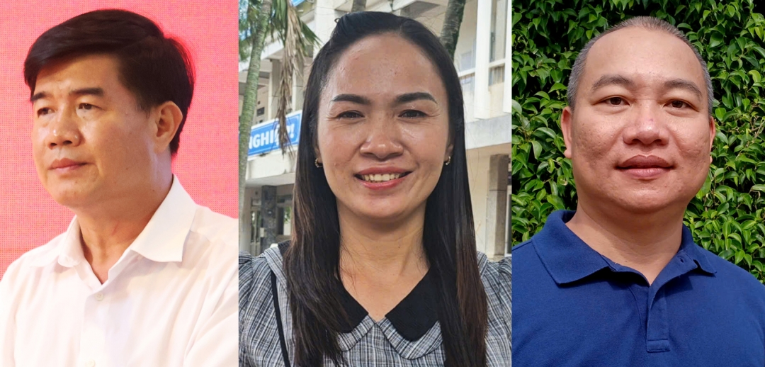 | Đồng chí Lương Nguyễn Minh Triết (áo sáng bên trái), Ủy viên dự khuyết Trung ương Đảng, Bí thư Tỉnh ủy, cùng lãnh đạo Sở GD-ĐT thăm và tặng hoa chúc mừng Nhà giáo ưu tú Ngô Thị Loan. |