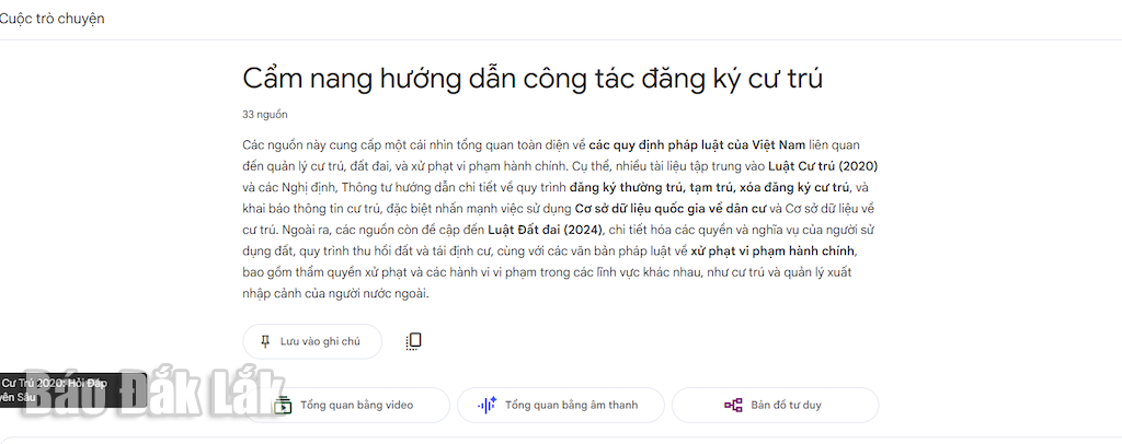 Theo đó, “Cẩm nang hướng dẫn công tác cư trú” được tích hợp trên nền tảng NotebookLM (một công cụ AI do Google phát triển), giúp cán bộ Công an cấp xã, phường tra cứu, trích xuất nhanh nội dung từ các văn bản quy phạm pháp luật liên quan đến đăng ký cư trú.
