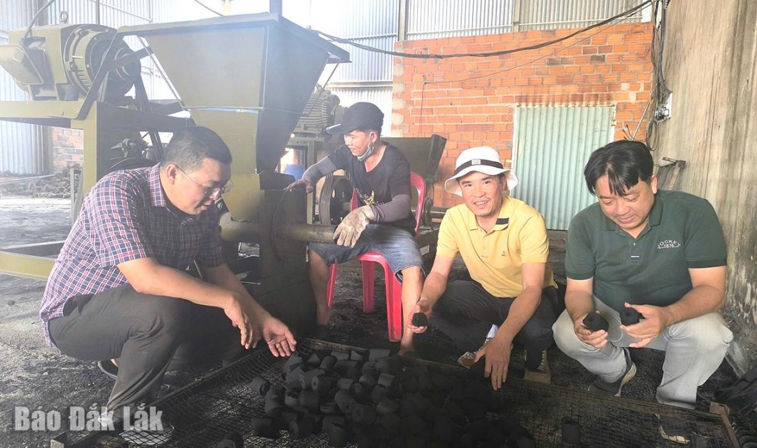 | Lãnh đạo HTX Liên Xuân Phát tham quan xưởng sản xuất than không khói của Công ty TNHH Thân Thiện. |