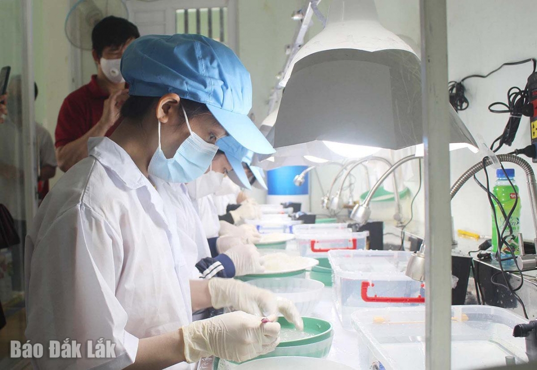 Công nhân sơ chế tổ yến sau khi thu hái tại cơ sở của bà Trần Bảo Châu. |