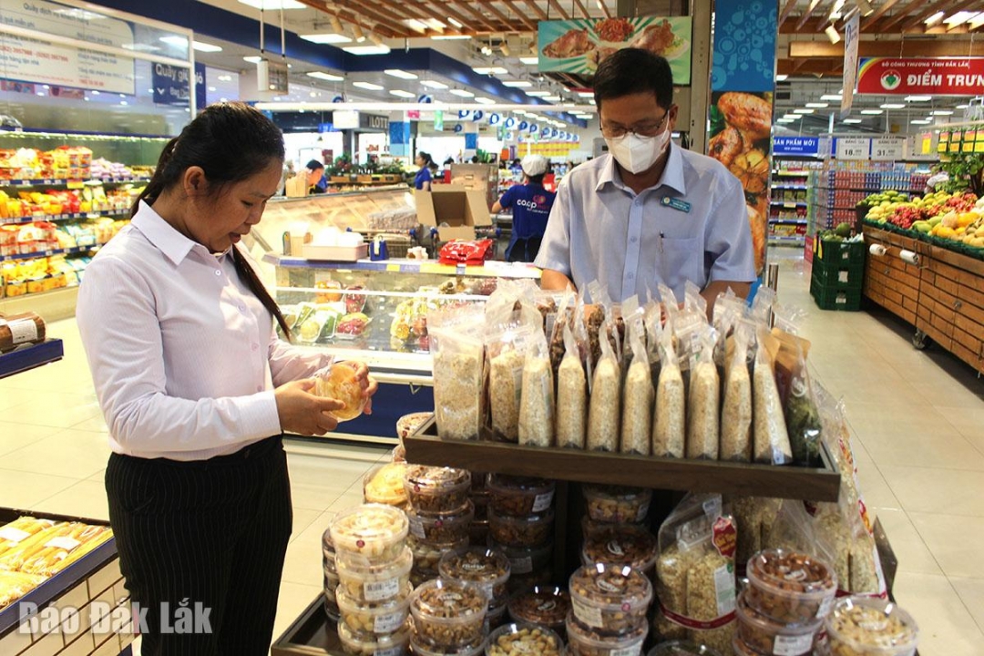 Lực lượng chức năng kiểm tra hàng hóa bán tại Siêu thị Co.opmart Buôn Ma Thuột. |