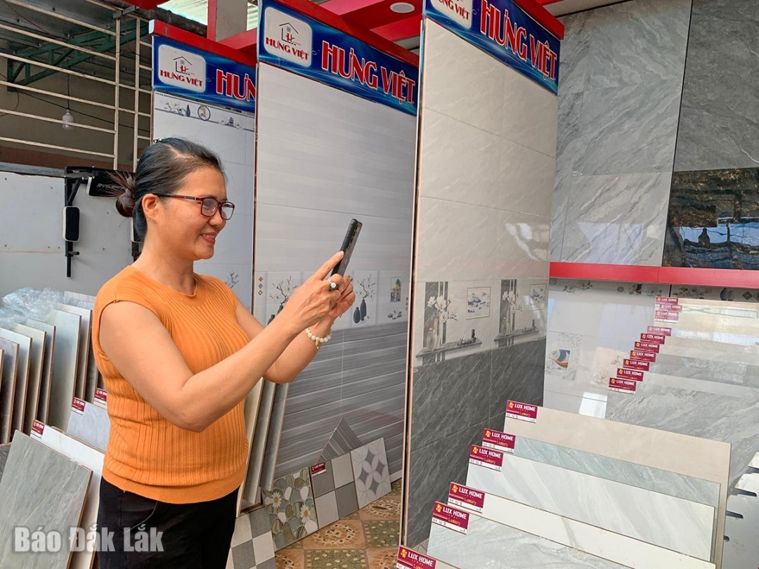 Thế nhưng, được sự động viên và hướng dẫn của các con, ở tuổi ngoài 50, bà bắt đầu học cách sử dụng điện thoại thông minh để livestream trên Facebook, quay các video ngắn giới thiệu gạch ốp lát mới, tư vấn chọn màu sơn, cập nhật giá thị trường, mở gian hàng trực tuyến bán thêm đồ dùng gia đình trên nền tảng TikTok.