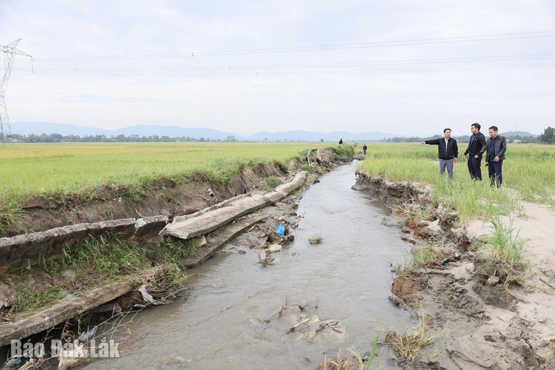 | Công ty TNHH MTV Quản lý công trình thủy lợi Đắk Lắk kiểm tra tình hình hư hỏng kênh mương trên địa bàn xã Yang Mao. |