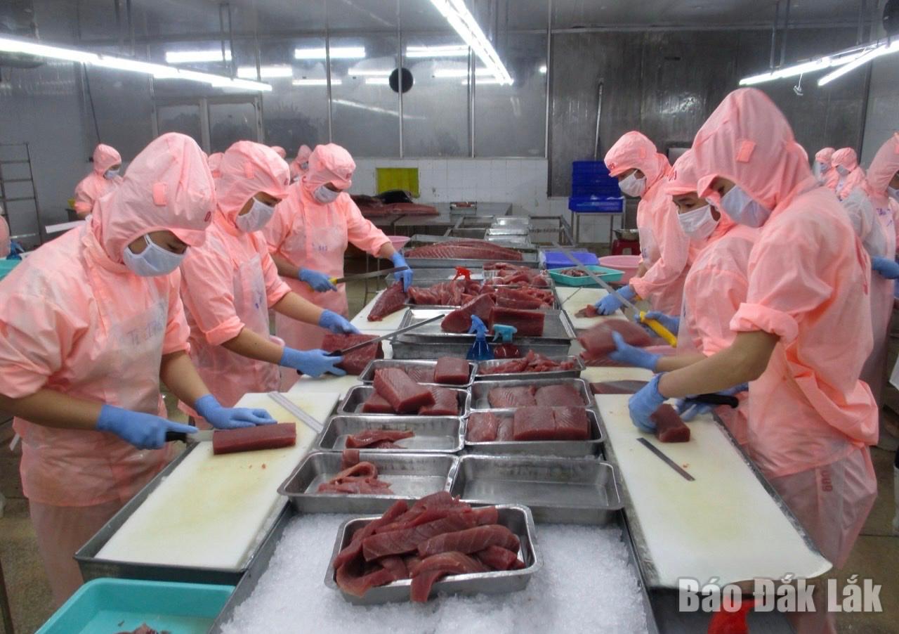 | Công nhân chế biến cá ngừ đại dương tại Công ty Cổ phần Bá Hải. |