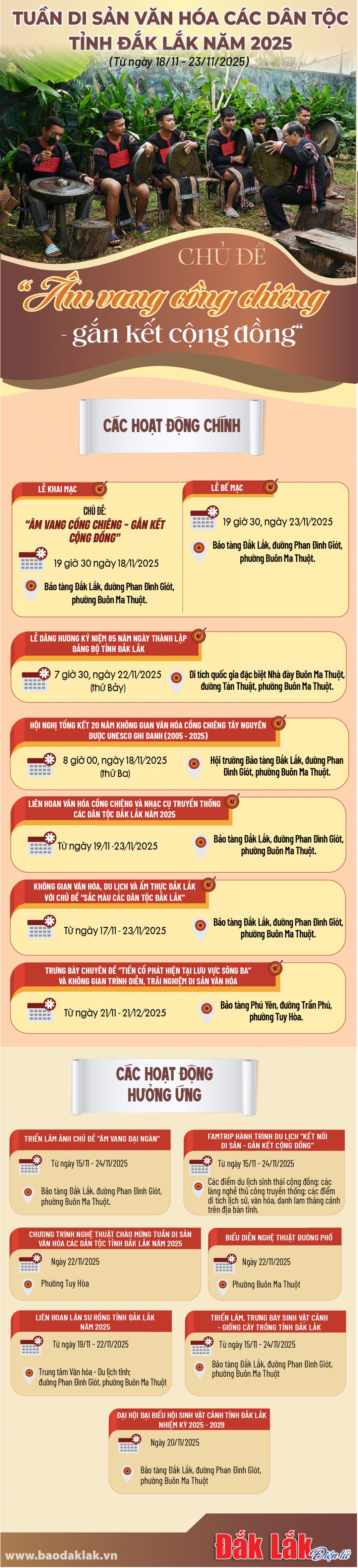 (Infographic) Tuần Di sản văn hóa các dân tộc tỉnh Đắk Lắk năm 2025: “Âm vang cồng chiêng - gắn kết cộng đồng”