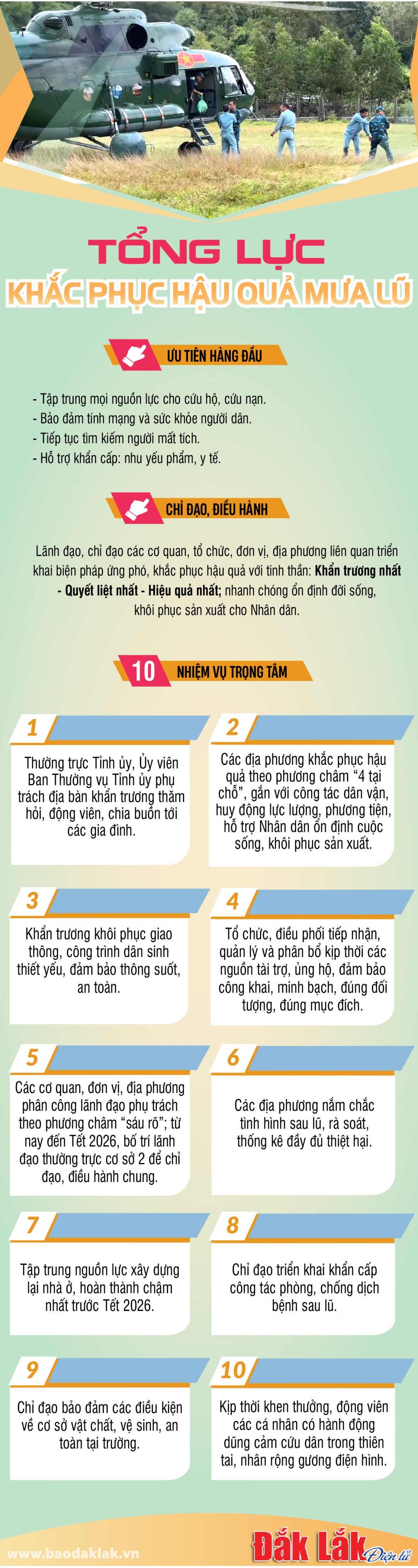 Trước những thiệt hại nghiêm trọng do mưa lũ gây ra, tỉnh Đắk Lắk đang huy động tổng lực khắc phục hậu quả, tập trung hỗ trợ kịp thời cho người dân tại các khu vực bị ảnh hưởng, nhanh chóng ổn định đời sống, khôi phục sản xuất cho nhân dân.