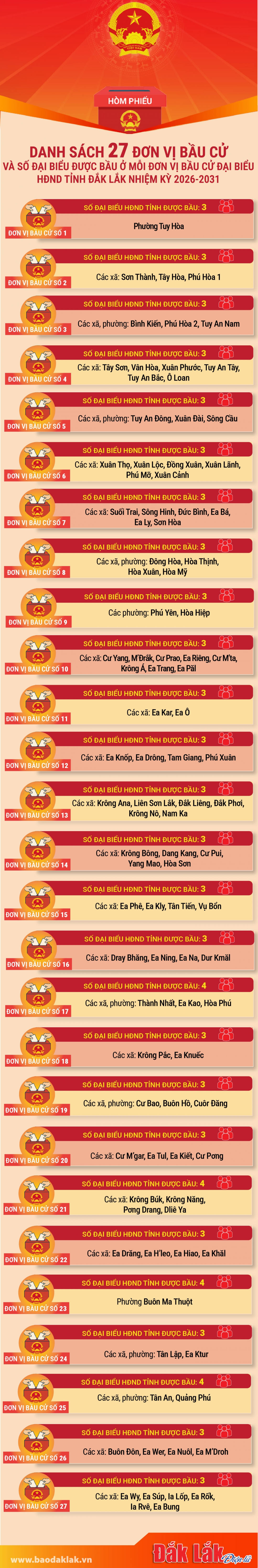 (Infographic) Danh sách 27 đơn vị bầu cử và số đại biểu được bầu ở mỗi đơn vị bầu cử đại biểu HĐND tỉnh Đắk Lắk nhiệm kỳ 2026-2031