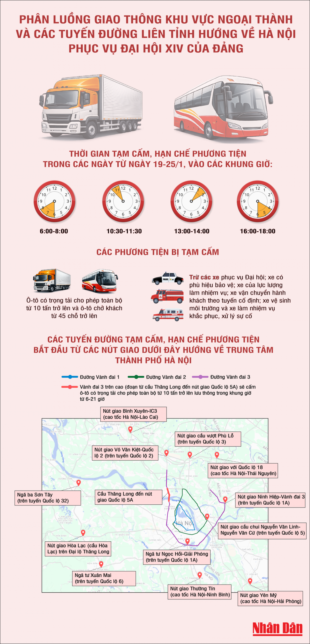 (Infographic) Phân luồng giao thông khu vực ngoại thành và các tuyến đường liên tỉnh hướng về Hà Nội phục vụ Đại hội XIV của Đảng