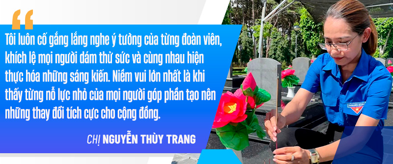 Sự dấn thân của Trang không chỉ thể hiện ở những kết quả ấn tượng, mà còn ở tinh thần không ngại khó, không ngại khổ. Trang luôn là người đi đầu trong các chiến dịch tình nguyện, không quản ngại thời tiết nắng gắt hay mưa dầm để cùng đoàn viên thực hiện các công trình. Dù công việc có bận rộn đến đâu, chị vẫn luôn giữ được sự nhiệt tình, kiên nhẫn và nụ cười rạng rỡ.