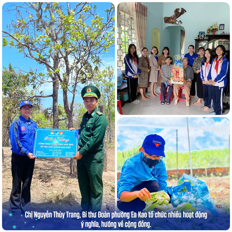 Thay vì lựa chọn con đường ổn định sau khi tốt nghiệp ngành sư phạm, chị Nguyễn Thuỳ Trang quyết định lựa chọn và say mê hoạt động với công tác Đoàn và Mặt trận từ năm 2015. Với sự nhiệt huyết và năng lực nổi bật, chị nhanh chóng được tín nhiệm, lần lượt đảm nhận nhiều vai trò quan trọng, từ Phó Chủ tịch Ủy ban MTTQ phường Ea Tam đến Bí thư Đoàn phường. Khi đơn vị hành chính sáp nhập, Trang tiếp tục được giao trọng trách Bí thư Đoàn phường Ea Kao.