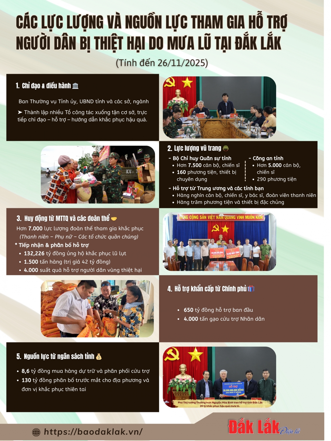 Địa hình vùng lũ ở các xã ngập nặng lúc này vô cùng phức tạp. Nhiều đoạn đường đã biến thành sông, nước chảy xiết và xoáy cuộn. Quân khu 5 đã quyết định nhanh chóng điều động lực lượng, cùng 3 chiếc xe thiết giáp chuyên dụng chi viện cho tỉnh Đắk Lắk. Những chiếc xe đặc biệt đã chở hơn 3.000 suất quà thiết yếu đến tận tay bà con ở vùng ngập sâu, giúp họ vượt qua những ngày đói rét. Thượng sĩ Phạm Ngọc Lực, chiến sĩ trẻ thuộc Bộ CHQS tỉnh Đắk Lắk cho biết: Chúng tôi phải đưa bà con đến nơi an toàn, đảm bảo từng gói hàng đến tay bà nhân dân một cách nhanh chóng nhất”.