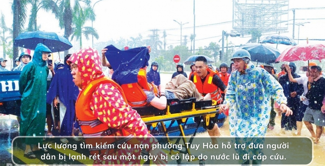 Tại các phường Tuy Hòa, Bình Kiến và Hòa Hiệp, công tác cứu hộ nhận được sự hỗ trợ lớn. Lực lượng Công an đã phối hợp với đội xuồng hơi thể thao đến từ TP Đà Nẵng và các đội tình nguyện viên từ nhiều tỉnh, thành khác. Thậm chí, thuyền, thúng của ngư dân địa phương cũng được huy động tối đa để tổ chức ứng cứu xuyên đêm.