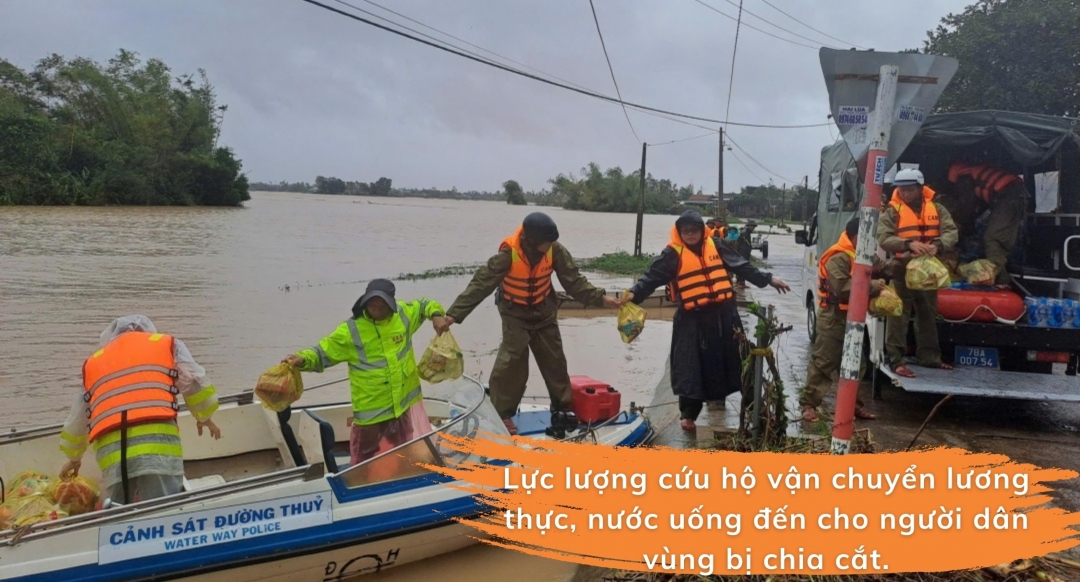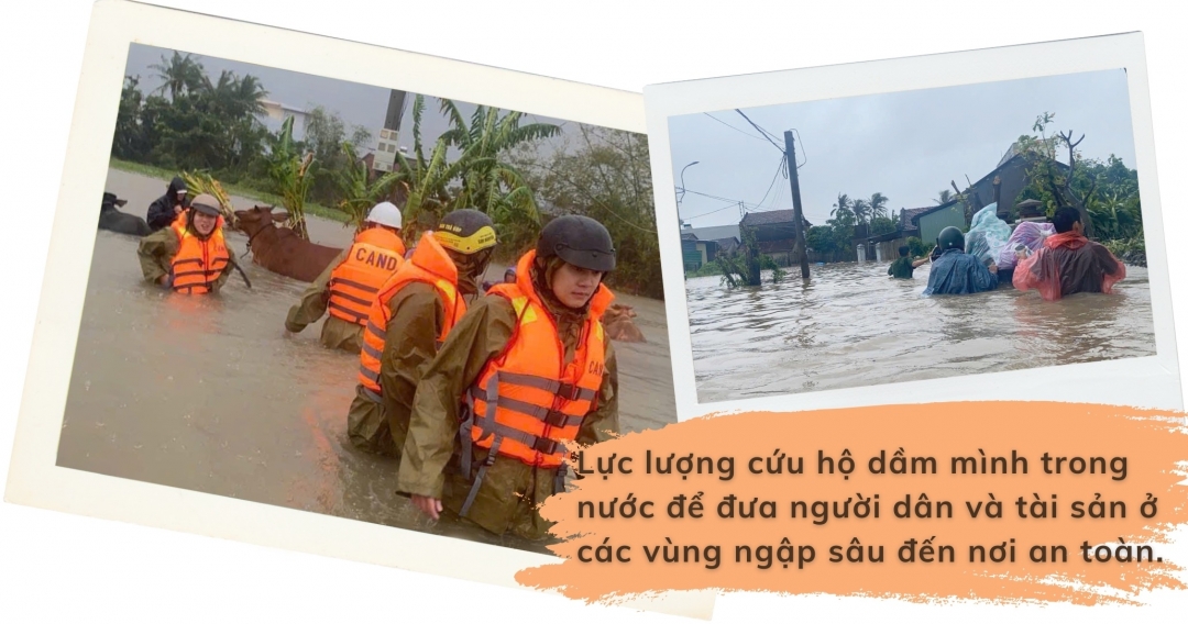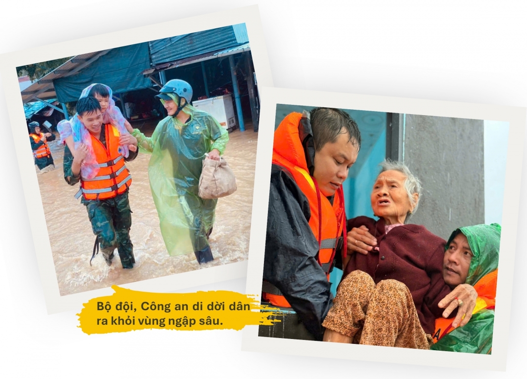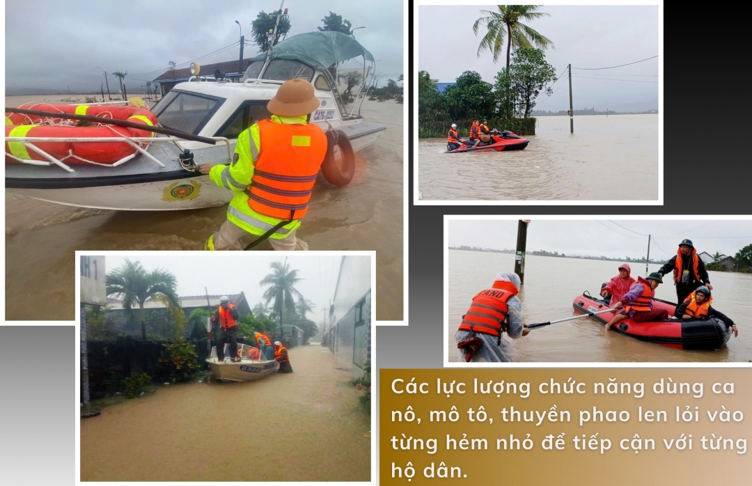 Bằng sự quả cảm, lực lượng Công an đã tiếp cận từng ngôi nhà, ưu tiên đưa người già, trẻ nhỏ và phụ nữ mang thai lên ca nô đến nơi an toàn trước tiên. Song song với việc di dời, lực lượng cứu hộ cũng kịp thời tiếp tế khẩn cấp, vận chuyển quần áo, lương khô, mì tôm và nước sạch đến những hộ dân chưa kịp rời đi, đảm bảo người dân có đủ sức khỏe để vượt qua cơn hoạn nạn.
