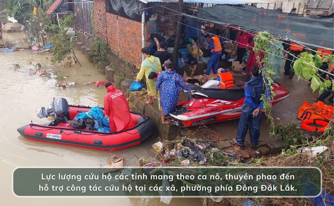 Không chỉ các lực lượng tại chỗ, mà công an, bộ đội từ nhiều tỉnh, thành cũng khẩn trương tăng cường về Đắk Lắk, phối hợp cứu dân giữa những ngày mưa lũ dữ dội. Công an tỉnh Lâm Đồng đã huy động cán bộ, chiến sĩ cùng ba ca-nô chuyên dụng thuộc Đội Cảnh sát giao thông đường thủy số 2, lên đường phối hợp chính quyền địa phương tại các khu vực ngập sâu, chia cắt trên địa bàn tỉnh Đắk Lắk, triển khai cứu nạn, cứu hộ và đưa người dân đến nơi an toàn. Những chuyến ca nô dầm mình trong dòng nước chảy xiết của đội đã đưa 25 hộ dân, với 72 người, rời khỏi vùng nguy hiểm đến nơi an toàn. Song song đó, lực lượng cứu hộ tiếp tục vận chuyển nhu yếu phẩm thiết yếu tiếp tế cho các hộ còn bị cô lập, bảo đảm không ai bị thiếu đói hay bỏ lại phía sau trong những ngày lũ dâng.